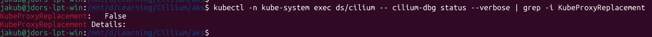 On my AKS BYOCNI cluster, Cilium still reports KubeProxyReplacement: False even though I disabled kube-proxy via --kube-proxy-config and set kubeProxyReplacement=true in the Helm values.