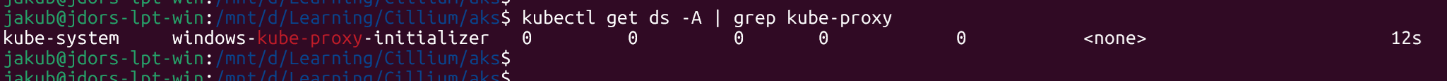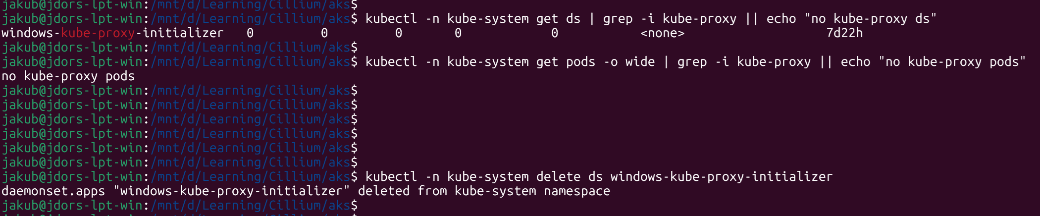 kube-proxyis the actual Linux Kube‑Proxy DaemonSet we want to get rid of (AKS will manage this based on the Kube‑Proxy config).windows-kube-proxy-initializeris a Windows helper DaemonSet that confuses Cilium’s kube‑proxy detection because its name containskube-proxy, even though it’s not doing anything on Linux nodes.